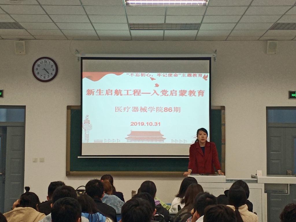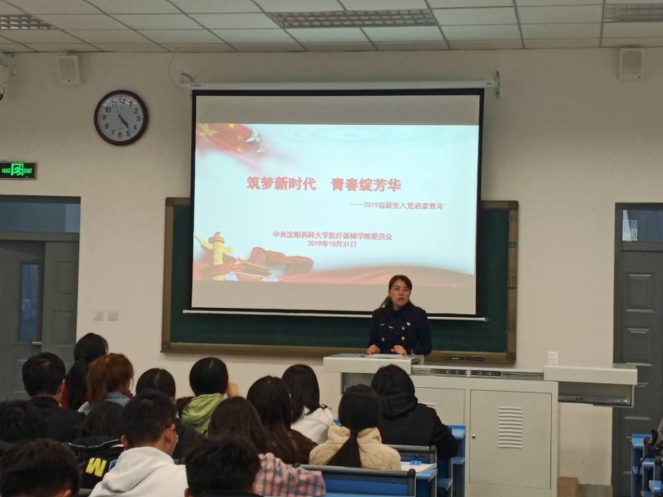 2019年10月31日,taptap点点体育党委副书记赵宏格以“筑梦新时代,青春绽芳华”为题为全体新生做入党启蒙教育。辅导员宋菁主持活动。