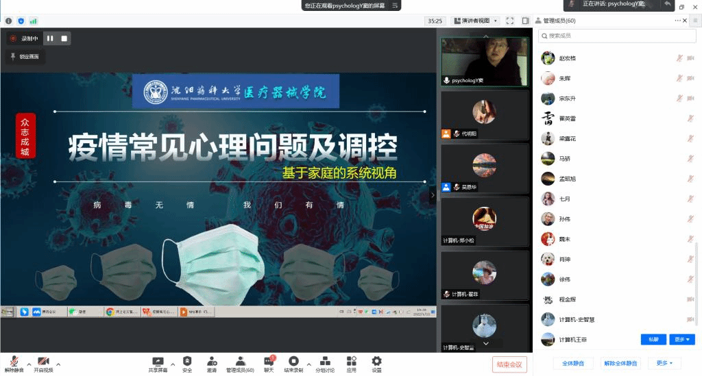 为进一步缓解疫情防控期间全院教职工居家办公的心理压力,做好疫情期间的心理调适,提高心理健康水平,taptap点点体育于4月13日,面向全院教职工开展线上心理健康讲座。本次讲座邀请到沈阳体育学院运动人体科学学院副教授,应用心理学博士窦广波,为全院教职工做题为《疫情常见心理问题及调控——基于家庭的系统视角》专题辅导讲座,学院全体教师参加了本次讲座。