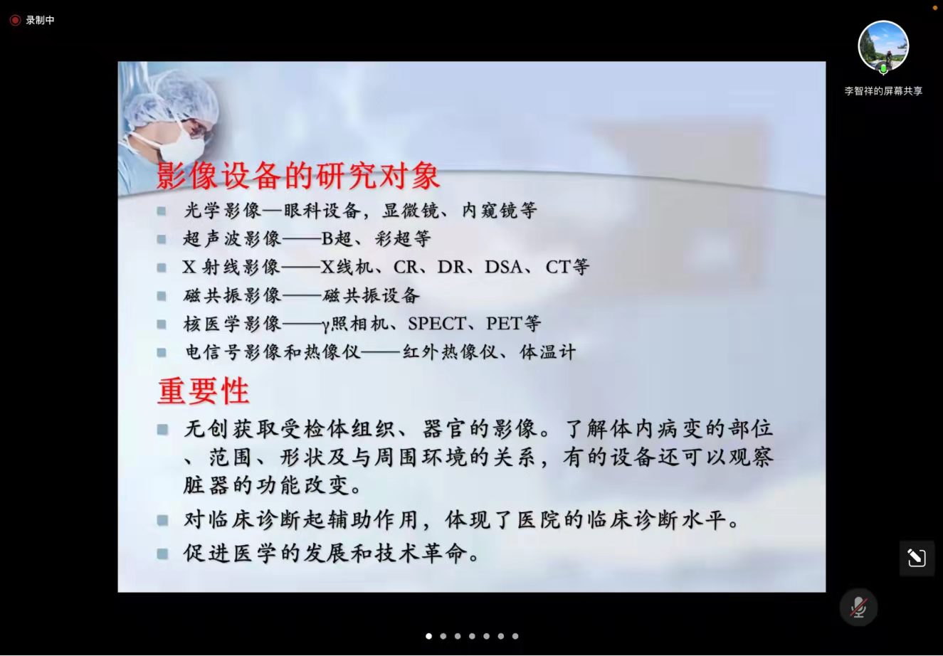 李智祥老师结合自身从事医疗器械行业33年丰富经验,围绕临床诊断设备课程为大家分享了影像设备的研究对象和重要性,帮助大家从理论与临床一线实际多角度认知这门专业课程,激发学生的学习热情。