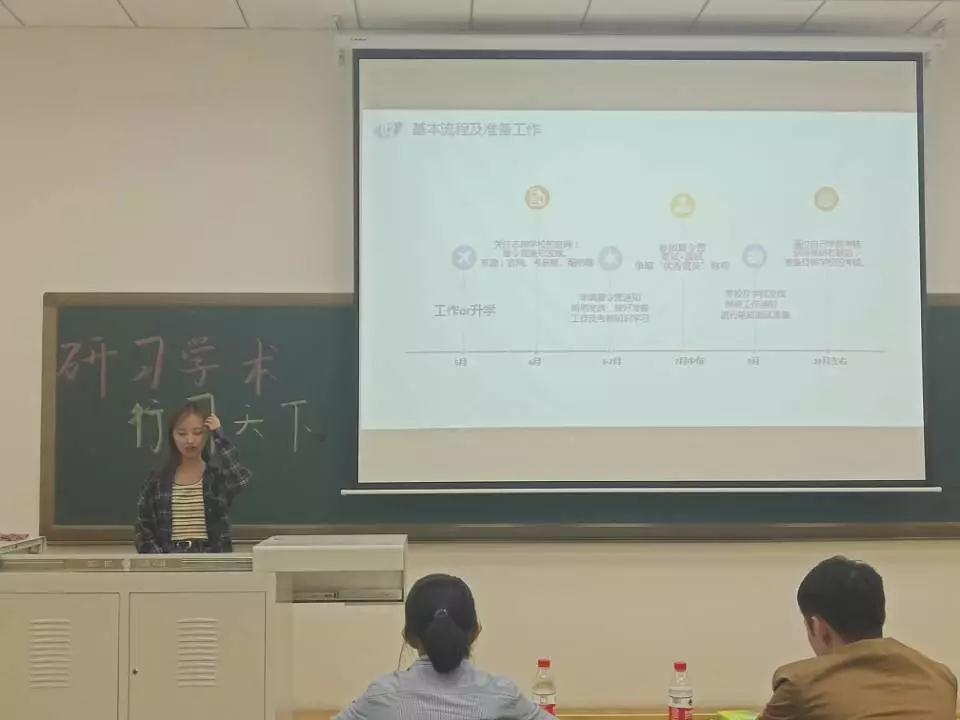 讲座开始,赵琳与黎萍学姐为同学们分享了考研经验,赵琳学姐从择校、初试、复试入手,推荐了多个对大家择校有帮助的公众号。黎萍学姐的“授课”风格颇为风趣,讲述了很多考研路上的小故事,坎坷之多凸显出学姐的毅力。随后张丽萍学姐将保研的条件逐一列出,之后为大家详细介绍了保研的基本流程及准备工作,并指出参加夏令营争取到“优秀营员”将会有丰厚的福利。最后是费云扬学长的留学经验分享。他说:准备出国留学的同学要有一个漂亮的简历,简历里要有你参加过的比赛奖项,在面试时要表决自己努力的决心,同时要体现出自己的实力。在研讨会接近尾声时,一位大二的同学向费云扬学长请教了问题:去日本留学对于日语要求会不会很高?学长表示自己的日语水平也不足以和日本大学生正常交流,但这并不影响他的出国进程。随后,研讨会也在热烈的掌声中拉下了帷幕。