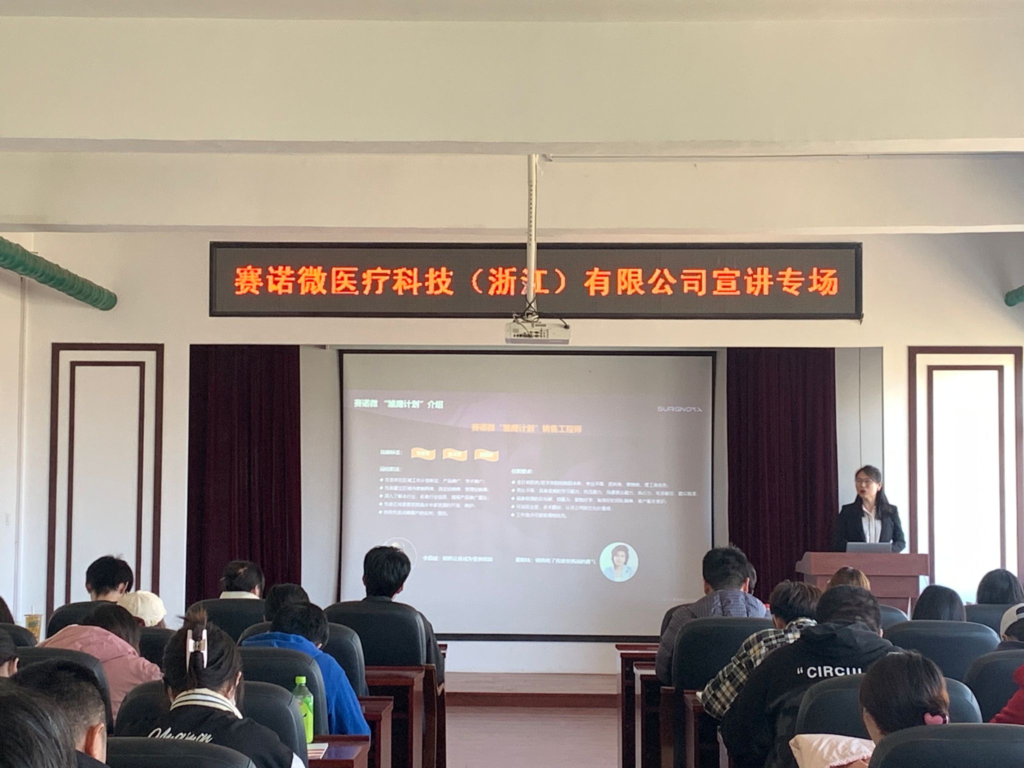 为充分发挥校园招聘主渠道作用,帮助毕业生“就好业”2023年4月26日的下午,taptap点点体育邀请赛诺微医疗科技(浙江)有限公司到学院举行春季招聘专场,为毕业生提供“点对点”就业岗位推荐服务,学院全体毕业生及其他年级有就业意向的学生参加了此次招聘宣讲会。