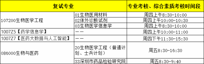 专业考核 | 随机抽取专业问题,考生作答。 | 1. 生物医学工程(01生物医用材料;02体外诊断试剂):为招生简章要求复试科目简答题,约10分钟。 2. 生物与医药【20生物医学工程;33深圳市药品检验研究院(生物医学工程研究方向)】:为招生简章要求复试科目简答题,约10分钟。 3. 生物医学工程(03生物医学信息学):包括2道计算机技术简答题,2道统计学简答题,约10分钟。 4. 药学信息学:包括2道计算机技术简答题,2道统计学简答题,约10分钟。 5. 医药大数据与人工智能:包括2道基础知识简答题,2道计算思维论述题,约10分钟。